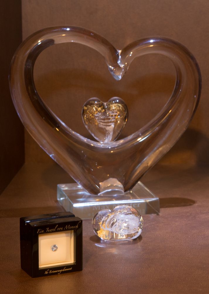 Ein Teil der Asche wird in einem speziellen Verfahren zu Kohlenstoff hergestellt. Daraus wird ein Diamant "gepresst". Die Restasche wird anschließend in den Schweizer Bergen verstreut (hier erhalten Sie eine Karte mit GPS Daten) un deine Bescheinigung über die erfolgte Bestattung oder wenn Sie es wünschen, zu Hause beigesetzt.
